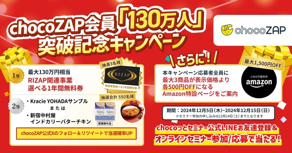 chocoZAP会員「130万人」突破記念キャンペーン !豪華賞品が当たる!12/15まで
