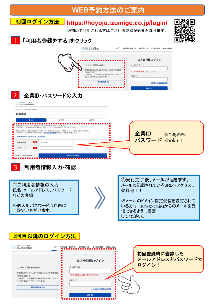 法人会員様専用サイトからご予約ください。企業/会員ID「kanagawa」、パスワード「shokuin」を入力してください。 - 【予約受付開始】
