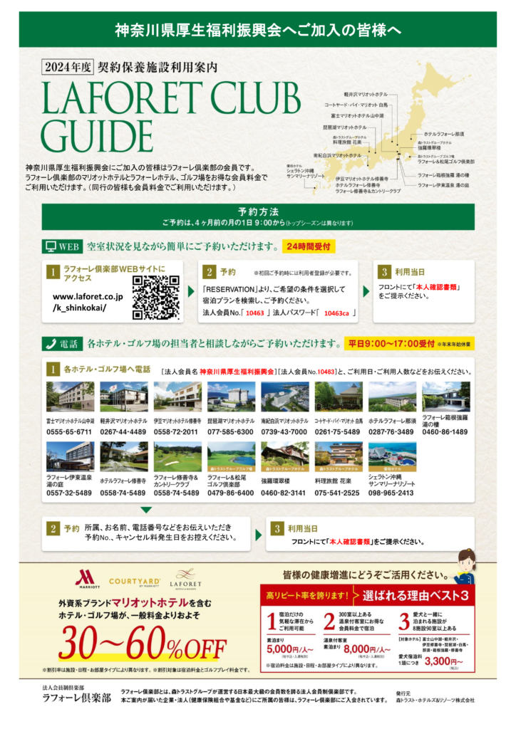振興会の会員は、「ラフォーレ倶楽部」と「セラヴィリゾート泉郷」の各宿泊施設をお得な料金でご利用いただけます。