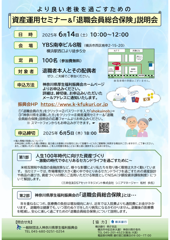 振興会の「退職会員総合保険」の事業説明と、ゆとりあるセカンドライフを過ごすための「資産運用セミナー」を開催いたします。ぜひ、ご夫婦でご参加ください。